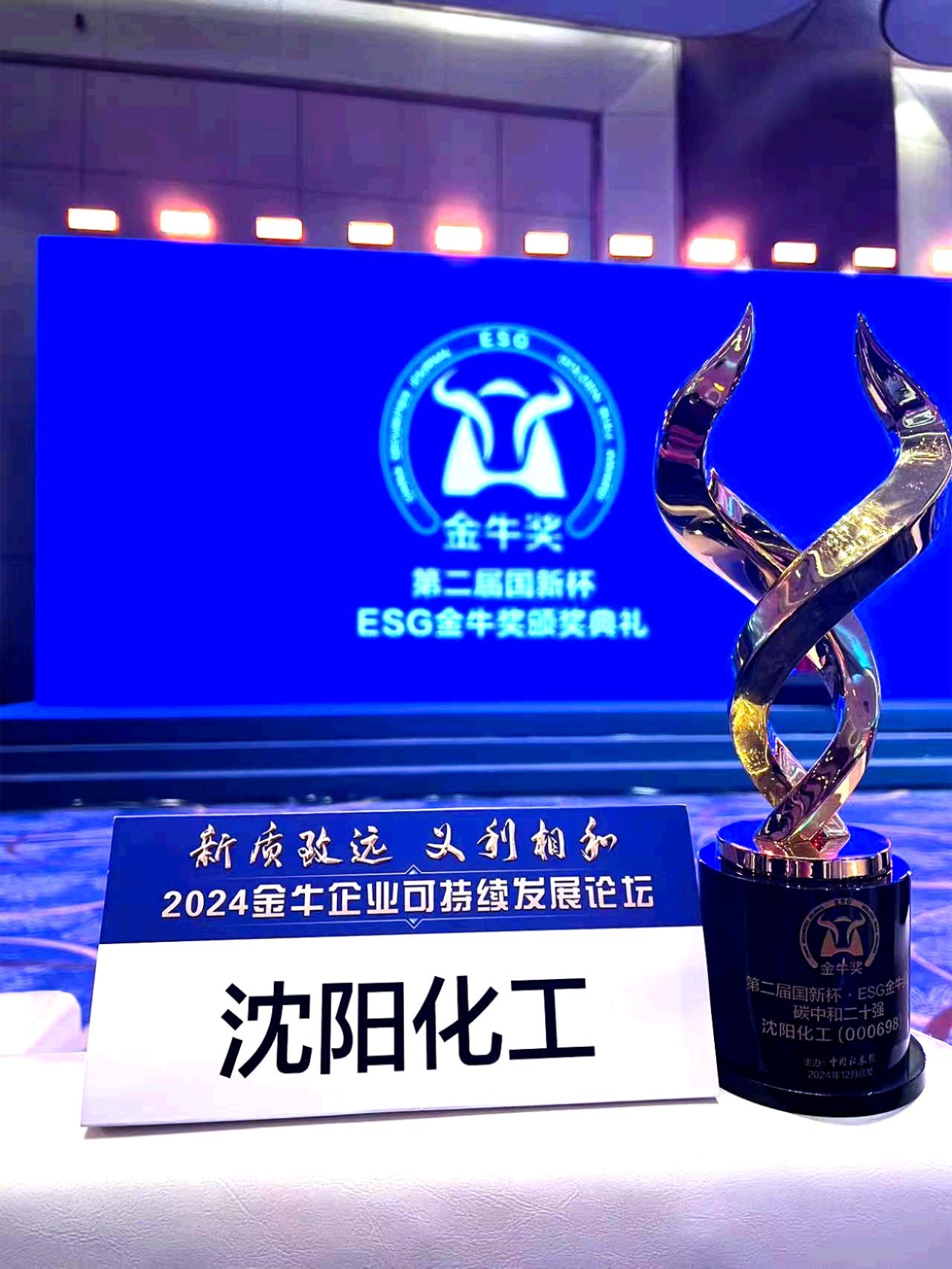 12月6日,由《中國(guó)證券報(bào)》攜手中國(guó)國(guó)新控股有限責(zé)任公司旗下國(guó)新咨詢(xún)有限責(zé)任公司聯(lián)合舉辦的“新質(zhì)致遠(yuǎn) 義利相和——2024金牛企業(yè)可持續(xù)發(fā)展論壇”暨“第二屆國(guó)新杯·ESG金牛獎(jiǎng)?lì)C獎(jiǎng)典禮”在上海圓滿(mǎn)落幕,沈陽(yáng)化工股份有限公司(以下簡(jiǎn)稱(chēng)“沈陽(yáng)化工”)在此次頒獎(jiǎng)典禮上榮獲“國(guó)新杯·ESG金牛獎(jiǎng)碳中和二十強(qiáng)”獎(jiǎng)項(xiàng)。這是公司繼去年獲得“第一屆國(guó)新杯·ESG金牛獎(jiǎng)碳中和五十強(qiáng)”獎(jiǎng)項(xiàng)后,再次獲得的ESG殊榮。